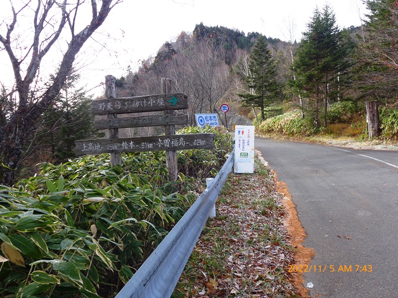 | 長峰峠から権兵衛峠に向かう途中で木曾御岳山のビュースポットがあったので撮影 | 権兵衛街道を進み、車を止めて権兵衛峠に向かいます |